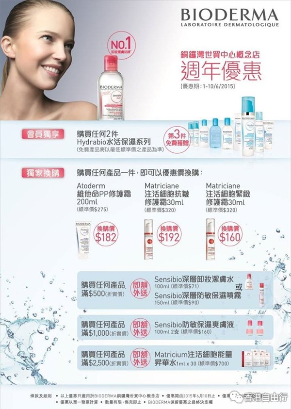 香港打折:BIODERMA贝德玛 铜锣湾世贸中心概念店周年优惠(至15年6月10日)
