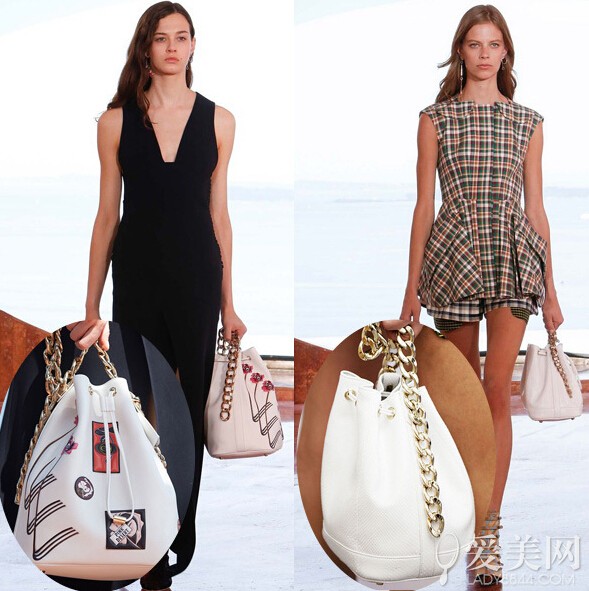 这两款白色水桶包清新典雅,粗链条的加入也为其增添了一份现代的气息。