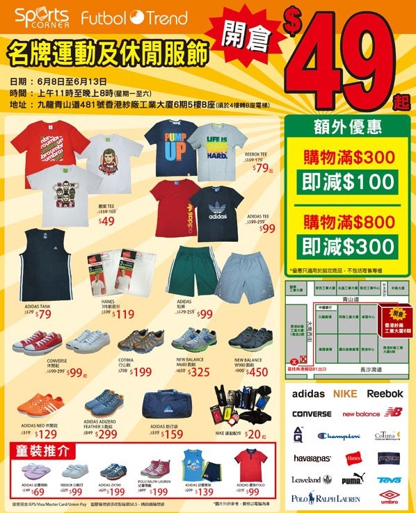 香港优惠:Sports Corner名牌运动及休闲服饰开仓$49起(15年6月8至13日);