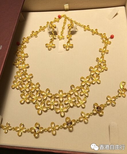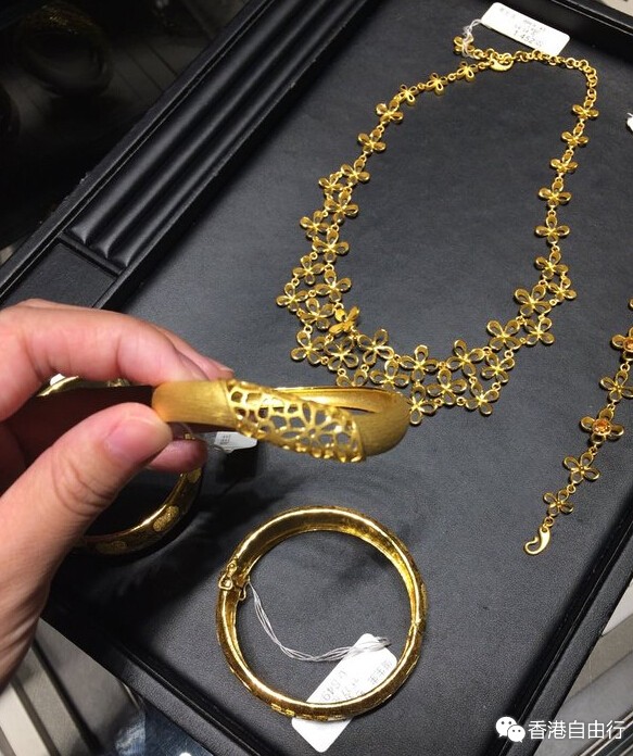 下面上图,一共买个一条四叶草项链,同款手链和耳环。一对龙凤镯,一个十分别致的格桑花不规则手镯,一个几何图形的小金项链(这个工费超级贵!)和一条男士项链。即时金价是344港币一克。