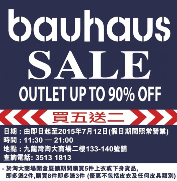 Bauhaus 开仓大割引低至1折优惠,另买五送二(至15年7月12日);