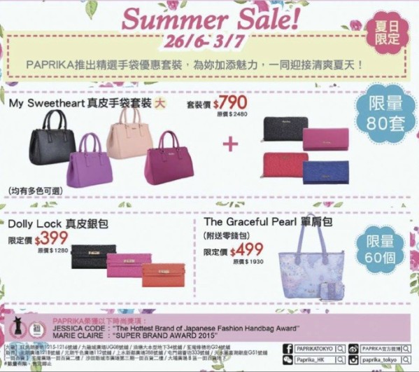 香港打折:PAPRIKA多款包包最新购物优惠(15年6月26至7月3日);