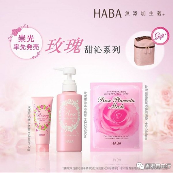 HABA无添加主义全新推出「玫瑰甜沁系列」,当中包括护手精华、沐浴精华及面膜已于铜锣湾及尖沙咀SOGO率先华丽登场。整个系列以皇牌成分鯊烯配合精选玫瑰精华,为您细致呵护肌肤同时让肌肤全日keep住水润亮丽,散发天然玫瑰芳香!现在来铜锣湾SOGO B1/F或尖沙咀SOGO B1/F HABA购买「玫瑰甜沁护手精华」或「玫瑰甜沁沐浴精华」,更可免费获赠「粉红精致手提化妆袋」1个*。