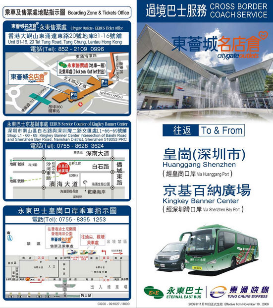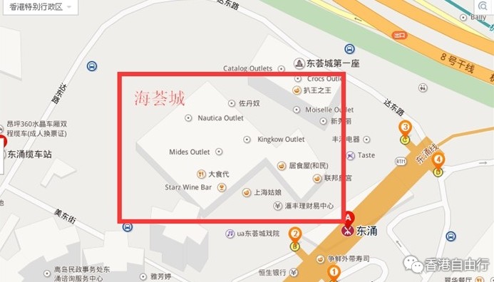 3.福田口岸路线:港铁东铁线至九龙塘站下车,转乘观塘线至太子站下,转乘荃湾线至荔景站下,再转乘东涌线至东涌站下,步行到东荟城,全程大约1.5小时