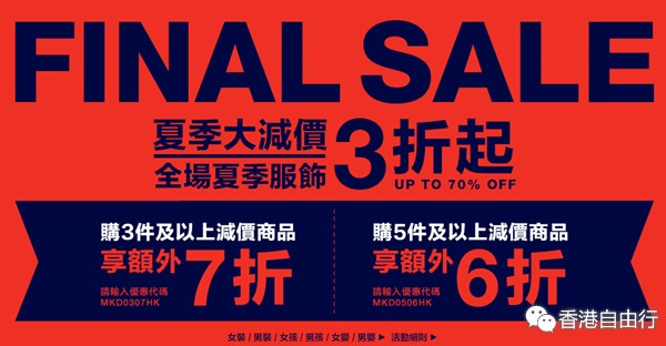 香港优惠:GAP FINAL SALE大减价 全场夏季服饰低至3折起(15年7月10日起)