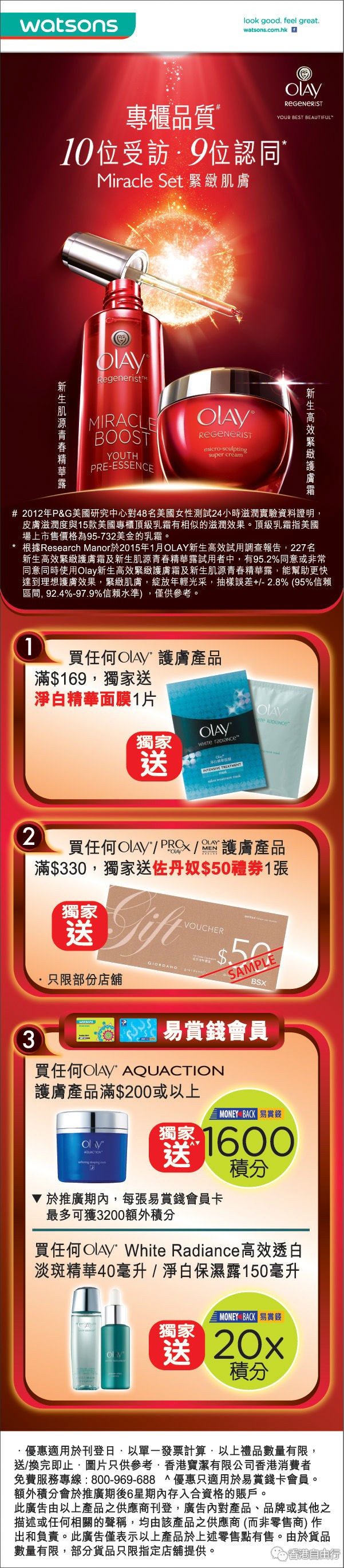 不用害怕,不是什么政治活动又来了,而是小编发现,最近香港的很多地方都被Olay侵占。人气最旺的地铁金钟站,电视广告,路牌广告,6月底4-5天的免费报纸封面,小编看到的就是Olay的大红瓶(香港名: 新生Super Cream)。 一查才知道,这个大红瓶,就是去年备受某官方机构热评的,媲美千元级面霜的Olay黄金单品。 一两百块的产品,上千元的产品体验。 小编都有些动心,于是为大家赶紧搜罗了屈臣氏的促销信息如下。另外,让人惊喜的还有,屈臣氏香港网站,已经可以直送内地了,赶快去了解一下吧。