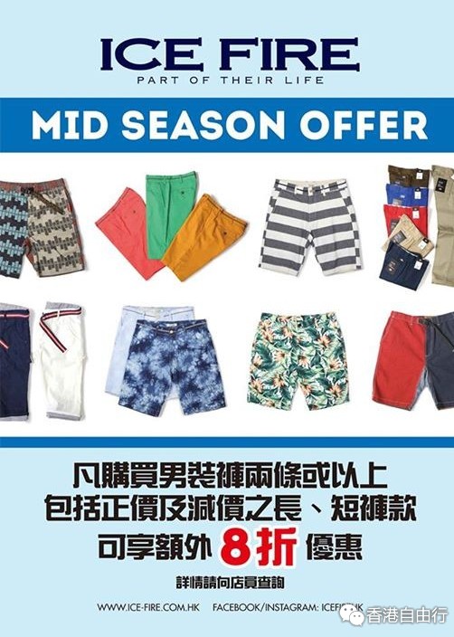 香港打折:ICE FIRE购买男装裤两条或以上可享额外8折优惠(15年7月15日起)