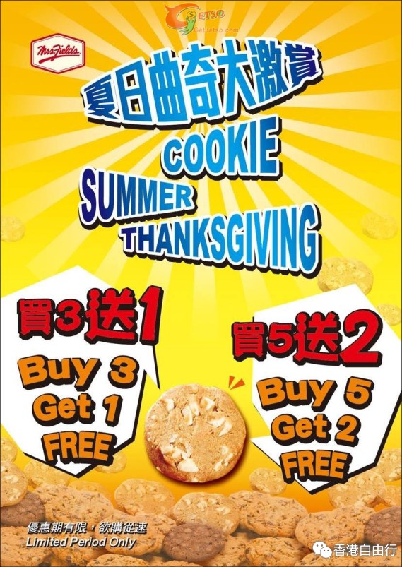 香港打折:Mrs.Fields 夏日曲奇买三送一/买五送二优惠(至15年7月31日)