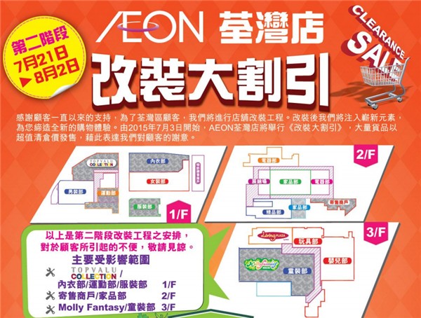 香港打折:AEON荃湾店改装大割引 大量商品超值购物优惠(至15年8月2日)