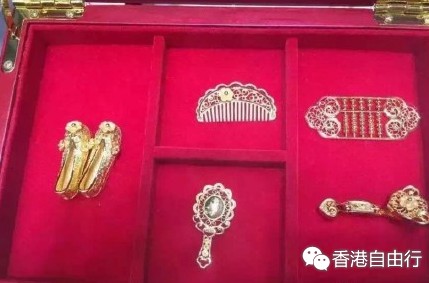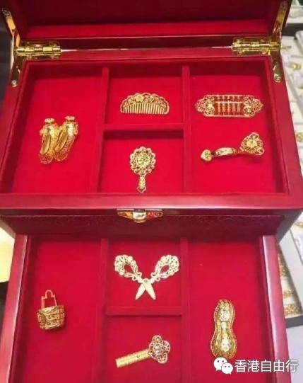 周大福嫁妆9件宝盒,手工非常精美,特别是小绣花鞋,简直是巧夺天工,这样的工艺在内地已经失传。現在金价下跌,給家中的掌上明珠囤一套,大概28000左右。