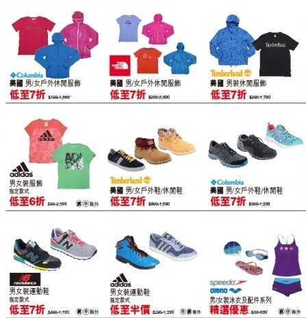 3. 男/女户外及运动服饰鞋履折实后2件再9折(混合单一部门单一发票计票、指定货品除外)