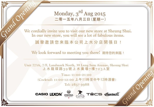 为庆祝新店开幕,E时代特别精选卡西欧手表以震撼价HK$199发售!由开幕当天起,凡于上水广场新店购买任何產品更可获赠HK$100优惠券。(数量有限,送完即止)