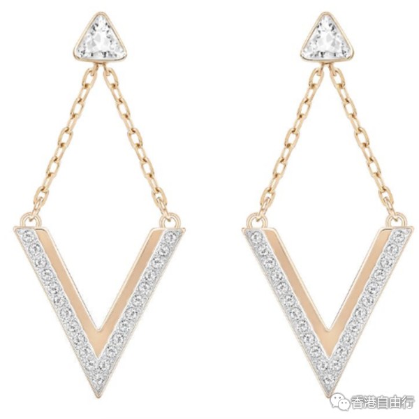 这对时尚百搭的镀玫瑰金色穿孔耳环,以富现代感的V形设计,营造赏心悦目的图案效果。 而闪烁迷人的透明密镶水晶,更尽显精致优雅的光彩。 您可单独佩戴三角形的单颗耳环,或加上随附的吊饰,以潮流感十足的V形线条示人。