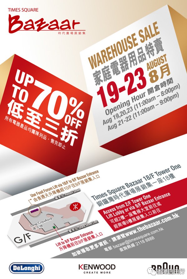 香港优惠:时代广场Bazaar 家庭电器用品特卖低至三折(15年8月19至23日)