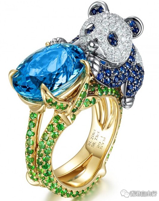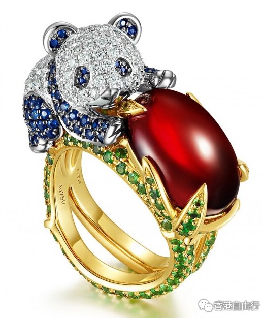绿色竹林间觅食的熊猫,可爱俏皮的模样令人无法忘怀。天然钻石和深色宝石镶嵌出俏皮可爱的熊猫,如论搭配海蓝宝石或红色碧玺都让熊猫显得可爱无敌。