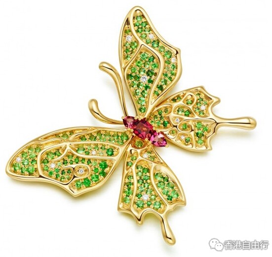 三色蝴蝶在大自然田野间翩翩起舞,粉色甜美浪漫,绿色娇艳动人,蓝色神秘迷离。设计师分别选取黄晶、粉红碧玺及透辉石赋予蝴蝶灵魂,以红宝石、翠绿石榴石和蓝色蓝宝石点缀蝴蝶的翅膀,展示自然界最原始的美丽色彩,完美的将宝石、蝴蝶、大自然的色彩融为一体。