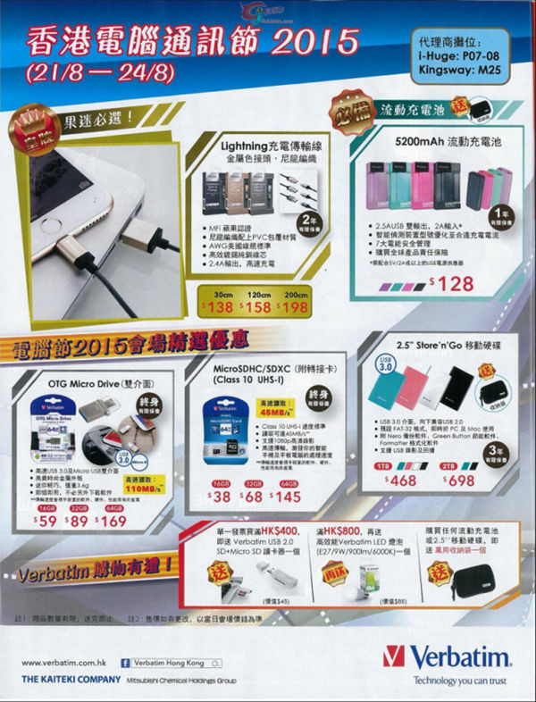 香港打折:Verbatim 电脑通讯节购物优惠(15年8月21至24日)