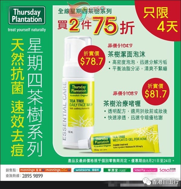 香港打折:Thursday Plantation 茶树系列2件75折优惠(至15年8月24日)
