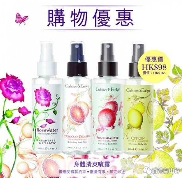 想在炎热的夏日时刻都保持清新香气?Crabtree & Evelyn身体清爽喷雾备有Citron、Tarocco Orange、Pomegranate同Rosewater四款香味,轻轻一喷,让你全身散发迷人芳香。即日起至9月9日凡购买任何产品,可以优惠价HK$98换购身体清爽喷雾一支。