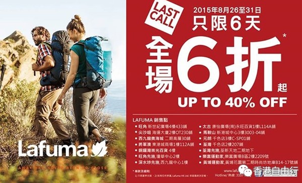 香港优惠:Lafuma换季大减价 夏季衣服低至6折(至15年8月31日)