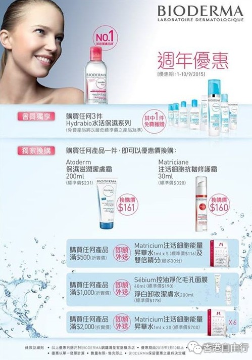 香港打折:贝德玛Bioderma 指定概念店周年优惠(至15年9月10日)