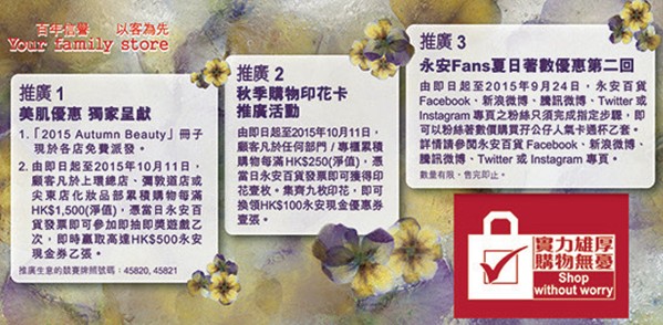 香港打折:永安百货Autumn Beauty Promotion 2015 美肌优惠(至10月11日)