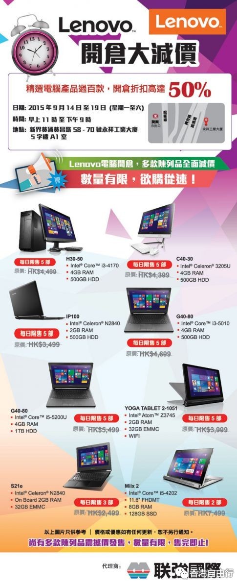 香港打折:联想LENOVO 开仓大减价 折扣高达50%(至15年9月19日)