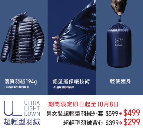 香港打折:优衣库UNIQLO超轻型羽绒限定购物优惠(至15年10月8日)