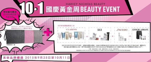 香港打折:Harvey Nichols Beauty 10.1国庆黄金周购物优惠(至15年10月11日)