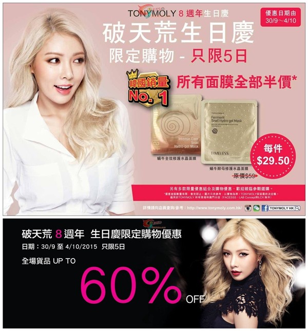 TONYMOLY 进驻香港8周年生日庆优惠周(至15年10月4日);