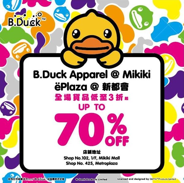 香港打折:B.Duck于Mikiki 及新都会广场分店推出特价优惠全场货品低至3折起!