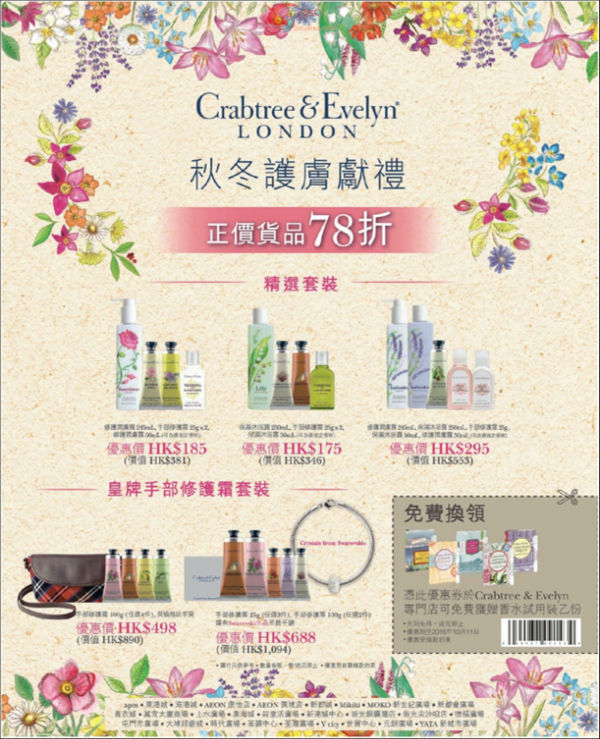 Crabtree & Evelyn 秋冬护肤献礼正价货品78折优惠(至15年10月11日);
