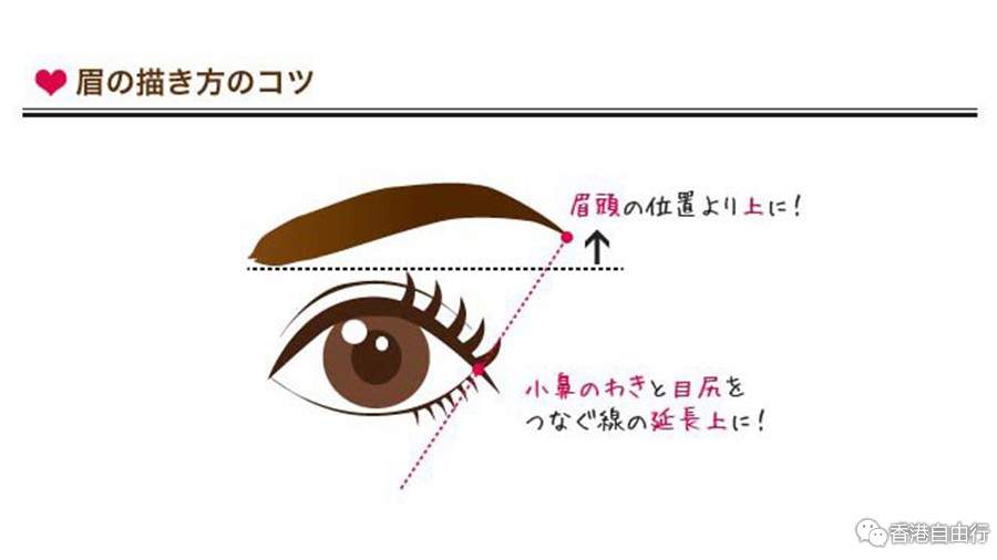 画眉时,眉毛的头与尾最为重要。应注意眉尾不能比眉头低,眉尾如能拉长至与眼角及鼻翼,于同一延长线上会更好看。