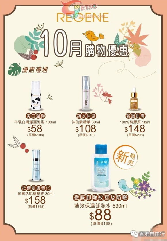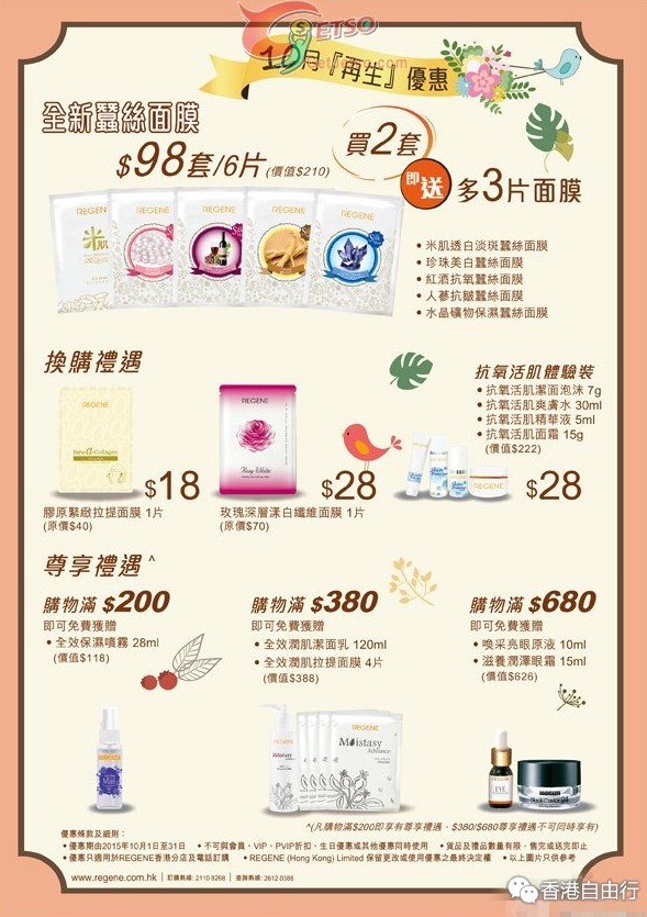 香港打折:Regene 10月份店内购物优惠(至15年10月31日)