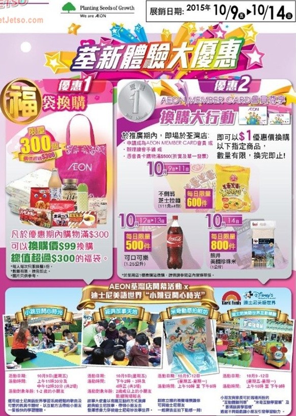 香港打折:AEON(永旺)荃新世代‧荃新体验荃湾店开幕优惠(至15年10月14日)