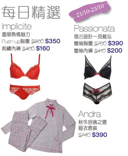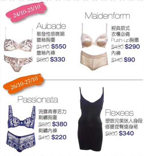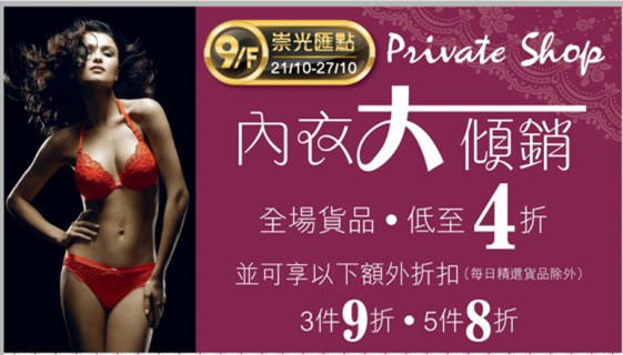 香港优惠:sogo崇光百货铜锣湾店9/F内衣大倾销全场货品低至4折(15年10月21日至10月27日)