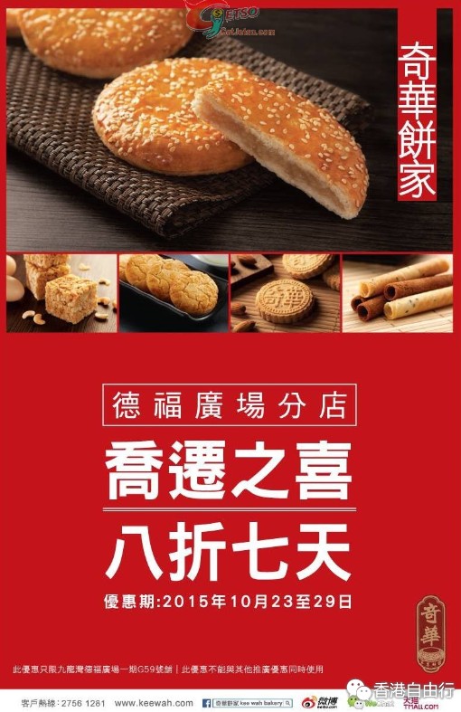 香港打折:奇华饼家德福广场新店乔迁之喜全店8折优惠(至15年10月29日)