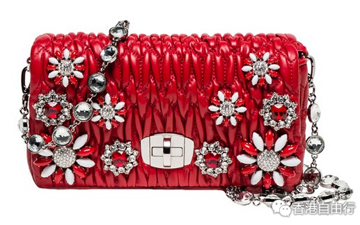 Miu Miu水晶宝石包款系列采用立体花 卉配饰点缀,由色彩缤纷的水晶宝石材 质制成,丰富的层次变化,栩栩如生, 满溢着对花卉的狂热,极具视觉冲击力, 凸显女孩酷帅和甜美的另一面。