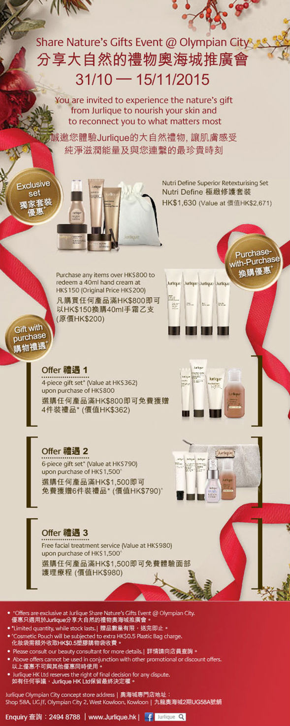 香港打折:茱莉蔻Jurlique 独家套装购物优惠&奥海城(至15年11月15日)