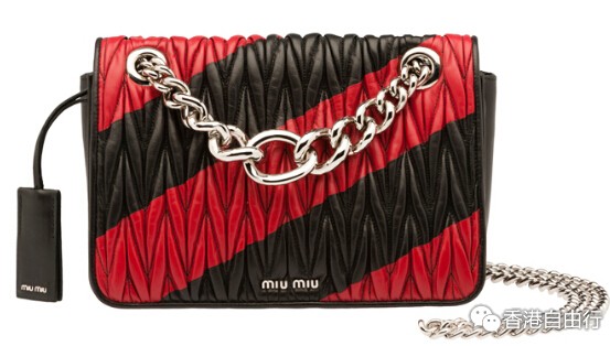 “MiuMiu Club”手袋的包身选用标志性的matelassé皮革制作而成,结构精致柔和,并配以经典版帕拉第奥风格链式肩带。颜色设计突破保守格调,其中一款甚至采用了醒目大胆的对角线形条纹,让人联想起警示危险的路牌标志。