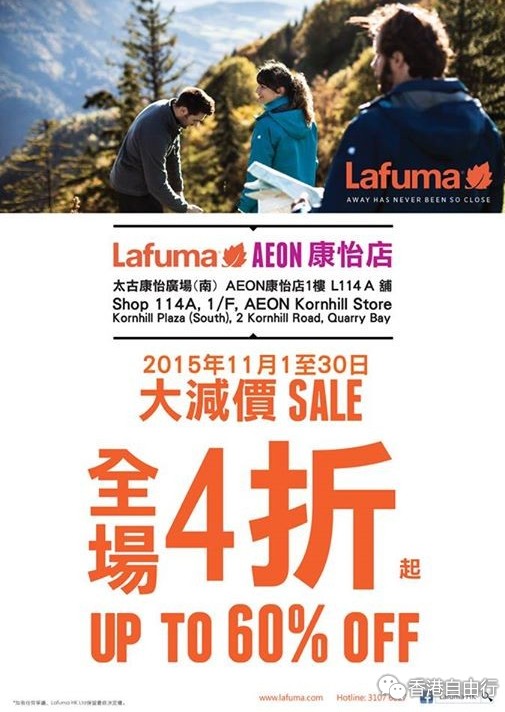 香港优惠:Lafuma AEON康怡店大减价全场4折起(至14年11月30日)