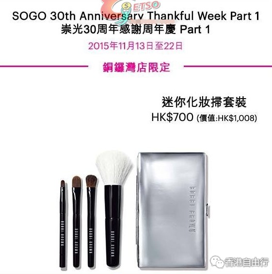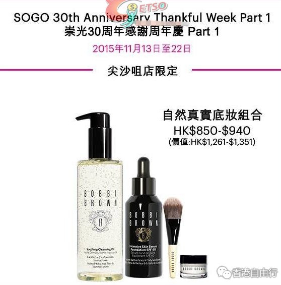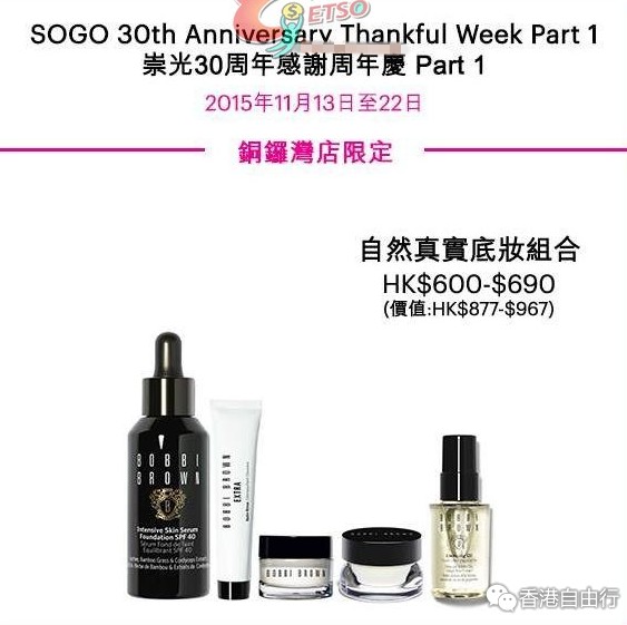 香港打折:芭比波朗Bobbi Brown sogo崇光30周年感谢周年庆购物优惠(15年11月13-22日)