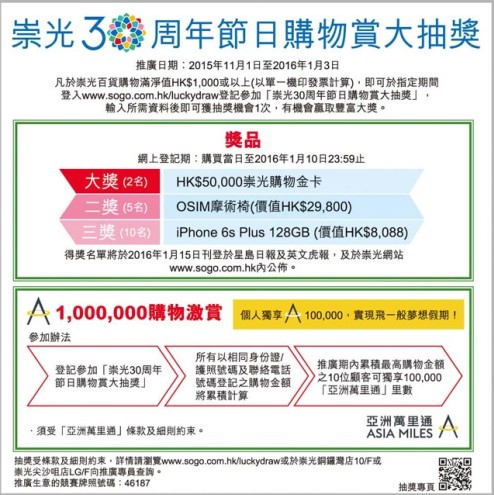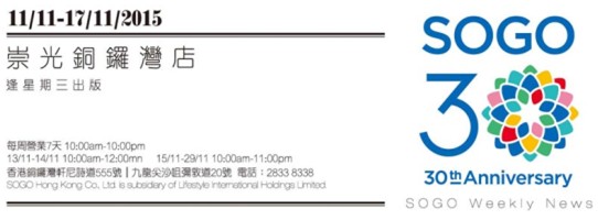 香港打折:sogo崇光百货铜锣湾店本周最新购物优惠(15年11月11日至11月17日)