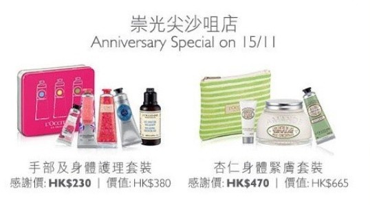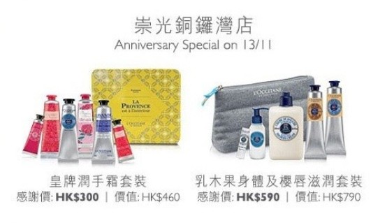 香港打折:欧舒丹L'OCCITANE sogo崇光30周年感谢周年庆购物优惠(15年11月13-29日)