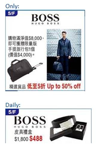从11月13日起,在铜锣湾崇光百货SOGO BOSS店精选商品5折优惠,购买正价商品每满$5000送$500现金券。