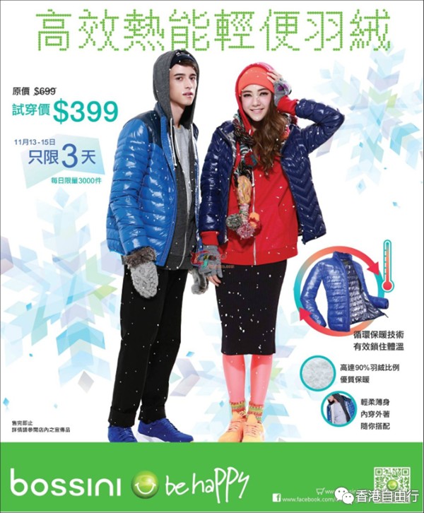 香港打折:Bossini 高效热能轻便羽绒$399优惠(至15年11月15日);