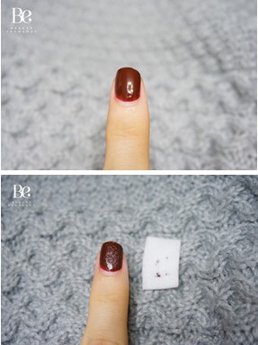 首先,小编先涂上一层指甲油,测试显色度和顺滑度。然后,在2分后用化妆绵在指甲上轻轻一按,测试各牌子的乾透速度。