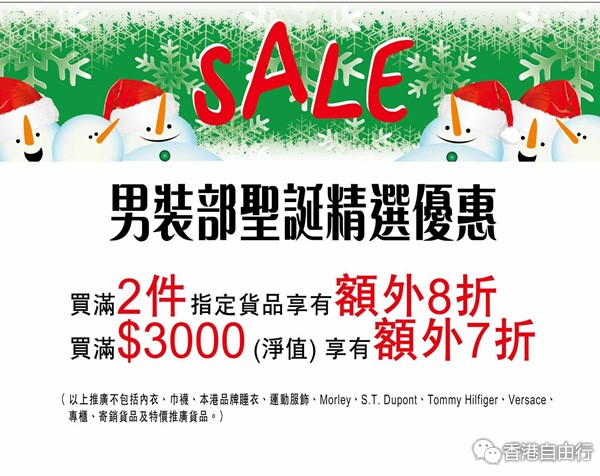 优惠2:凡於男装部购物满HK$3,000或以上(净值),可享额外7折优惠。