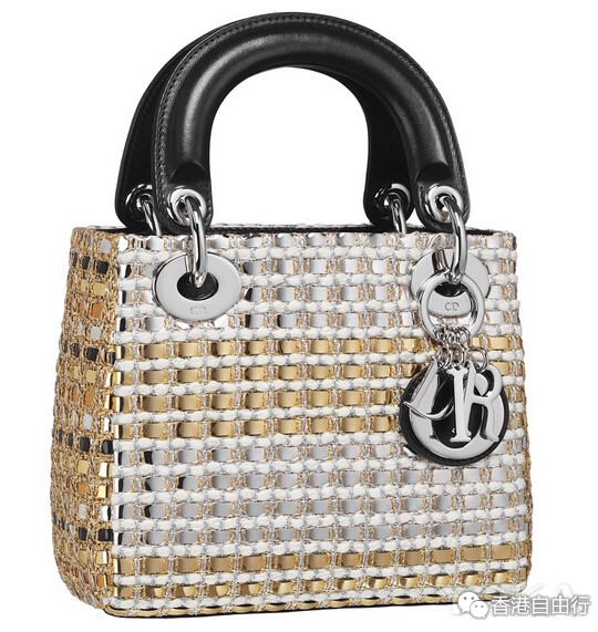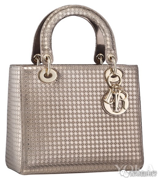 香槟色金属微型藤格纹小牛皮Lady Dior包袋