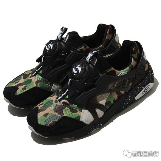 系列包括鞋履和服饰,皆以BAPE®的signature CAMO®图案注入PUMA的功能性运动gear之中。鞋款R698和Disc Blaze用上BAPE®的迷彩包装之后,令人眼前一亮,感觉犹如获得重新!至于服饰,当然不少得BAPE®最卖得的皇牌鯊鱼拉錬外套,而且所有迷彩同款更细心备有灰黑和绿色供大家选择,怕carry不到一身绿迷彩,选黑色就最好。